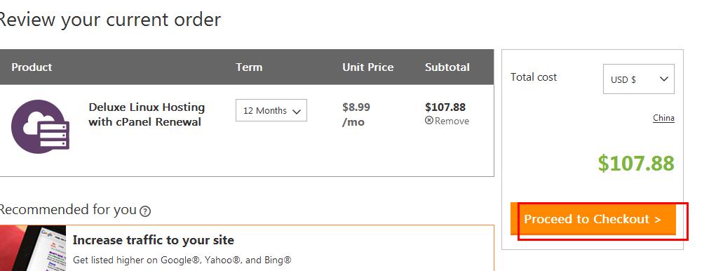 3.同样我们会自动转到GoDaddy的购物车里面,确认自己续费购买的产品,点击“Proceed to checkout”。